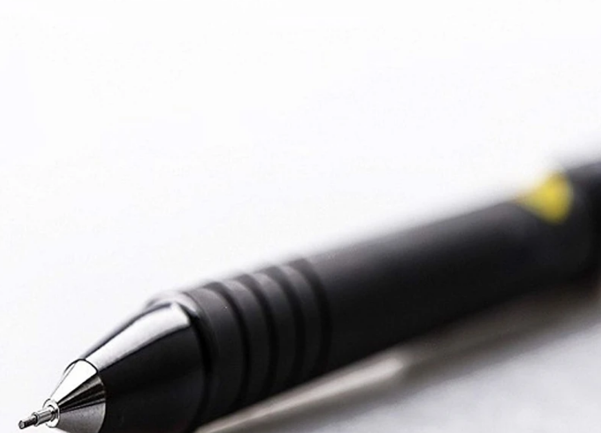 Là bút chì tự động vỏ đen với đầu bút có thể bấm được.