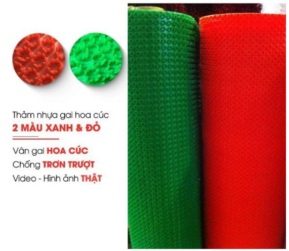 Thảm nhựa gai cúc được sản xuất bằng chất liệu nhựa pvc thảm mểm cuộn được , thảm không thấm nước , độ bền cao , thảm chống trơn trượt, đế thảm bám sàn , lóp gai dễ dàng lấy bụi bẩn trên đế dày dép.